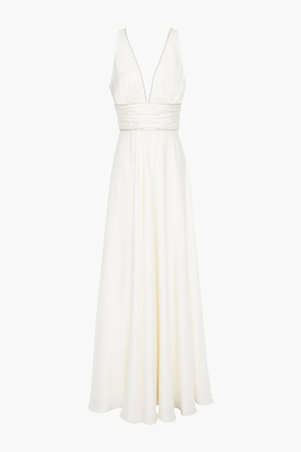 Timeless and effortlessly graceful, the Jenny Packham Song Flower bridal gown is crafted from luxurious, lustrous satin. This elegant wedding dress features a flattering V-neckline and softly gathered waist, flowing into a romantic A-line skirt that moves beautifully. Delicate, light-catching crystal embellishments add a subtle touch of sparkle, making it perfect for both garden weddings and stylish rooftop receptions. A stunning choice for brides who love refined, modern elegance with a hint of glamour.