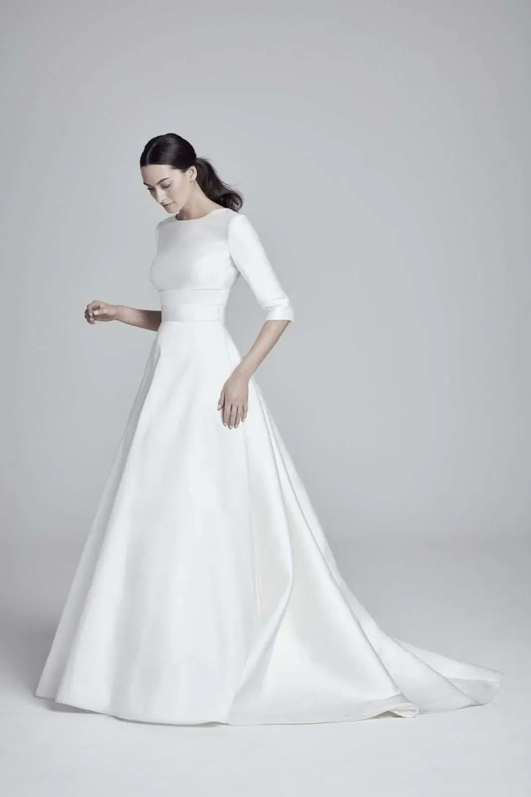 The Suzanne Neville Layla wedding dress is a timeless and minimalist bridal gown, perfect for modern brides seeking understated elegance. Designed with a structured bodice, high neckline, and flattering A-line silhouette, this dress offers a refined and sophisticated look.