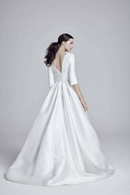 The low V-back with delicate button detailing adds a contemporary touch, while the soft train creates beautiful movement.